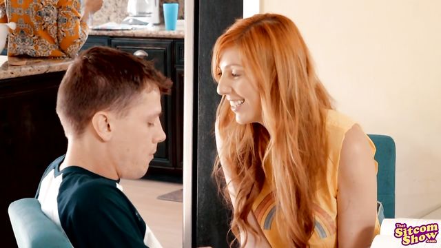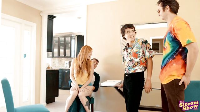 Description:Eric and Donna are studying in the living room as Kitty hangs out in the kitchen making cookies. Kitty keeps helpfully interrupting the kids, which annoys Eric. Donna decides to help him feel better by accidentally dropping her pen and ducking under the table to undo his pants and pull out his dick to start stroking. Soon enough, Eric has Donna's lips wrapped around his hardon as she sucks him off. They back off of each other when Kitty returns to the room to give Donna some water for her throat, but as soon as she leaves again Eric drops to his knees to feast on that redhead pussy!Eric is a maniac with his tongue, but Donna wants something a little harder. She gets to her feet so Eric can sit in her chair. Then she hikes up her miniskirt and pulls her panties aside so she can ride his dick as Eric jiggles her big jugs. The horny couple tries to keep it quiet as Donna bounces up and down on Eric's fuck stick, but they're caught in the act when Fez and Hyde walk in.Kitty brings out cookies for the kids to enjoy, but Eric and Donna chase them away so Donna can finish. She turns around on Eric's fuck stick, sticking her tits in his face as she goes to work on his dick. Fez sneaks back into the room to creep on his friends and grab a treat, but that doesn't stop the two randy lovers. Instead, Donna bends over the table to get one last climax. As Eric about to give Donna the facial she needs, Kitty walks in on them and startles Eric into jizzing on the cookies. Donna doesn't mind; she grabs a cookie and eats it much to Kitty's horror.