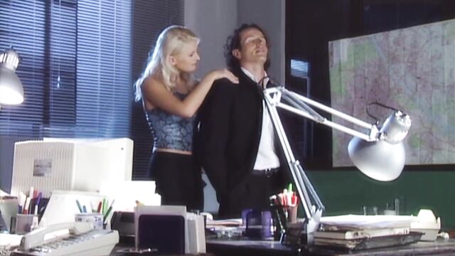 Description:A well hung detective is stressing about finding a missing girl, but his sexy blonde partner Sandra Russo knows how to calm him down. After a sensual massage and a makeout session, she gets down low and sucks on his big dick giving him a wet blowjob. Then, Sandra Russo climbs onto the desk and spreads her legs to take a deep pussy pounding. After sucking on her pussy to get her even wetter, this fine blonde babe gets on top and rides her big round ass on his cock giving him a pussy ride and some wild anal. This hung stud pounds her ass with some hardcore pumps, stretching her butt and giving her a real ass orgasm. To finish, she gets her man to the point of climax with her tight ass hole and then gets down low to take a big sticky facial, sucking his cock to clean up all the cum.