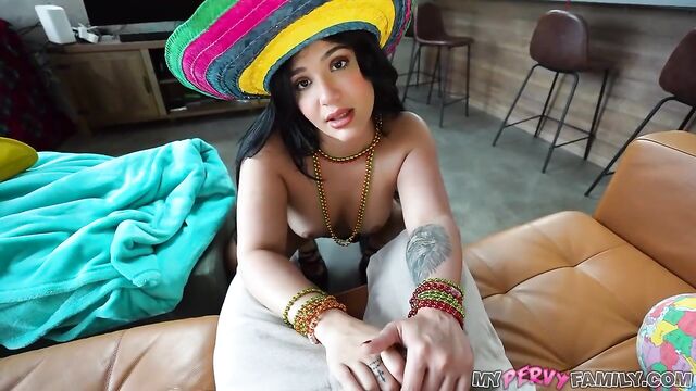 Description:Anais Amore loves Cinco de Mayo! She gets all decked out in beads and a hat and the tiniest shorts that expose her big, beautiful ass and heads over to her step-cousin Zeus' place. She even has a costume for him! But Zeus ain't no dummy. He knows his step-cousin Anais just wants to use him for his car to drive her to a party later. Anais is willing to make a deal. She takes off her top and shows her step-cousin her perky tits. She gets on her knees and makes an offer - she will have sex with her step-cousin Zeus if he will drive her to the Cinco de Mayo party later. Zeus is in and his cock comes out and slides right into his step-cousin's mouth. She bends over and spreads her big ass, Zeus begins to fuck her from behind. Anais twerks her lovely ass over her step-cousin's dick. She rides him, making herself cum hard while she is on top. Zeus porks his step-cousin's wet pussy until he pulls out and cums in her mouth. Anais swallows like a good girl and is ready to go party! Happy Cinco de Mayo, folks!